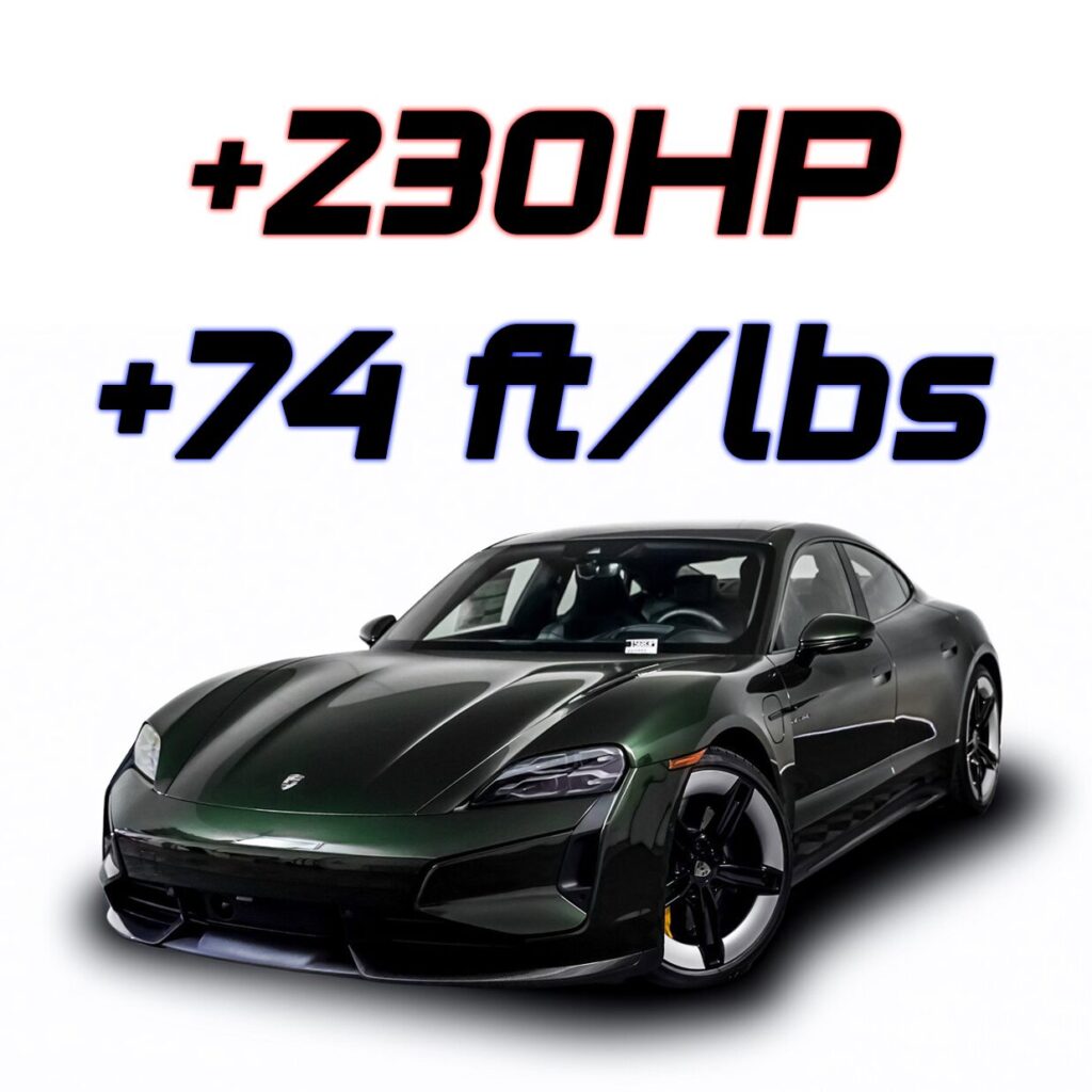 The Taycan Turbo is artificially detuned from the maximum possible 927 HP to 872 HP in launch control, 791 HP in Boost and 697 HP in normal mode. The torque is 730 ft/lbs, 656 ft/lbs and 656 ft/lbs respectively. With our upgrade the maximum power is increased to 927 HP, and the full torque of 730 ft/lbs is available in all modes.